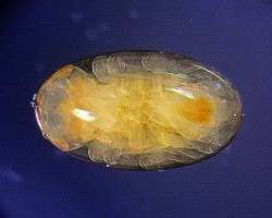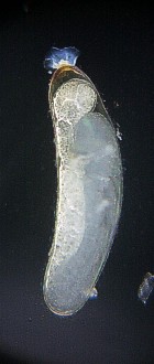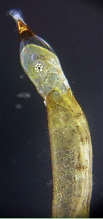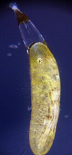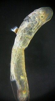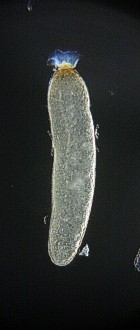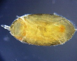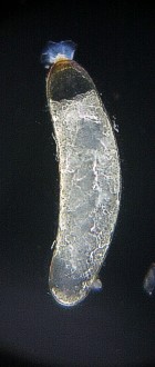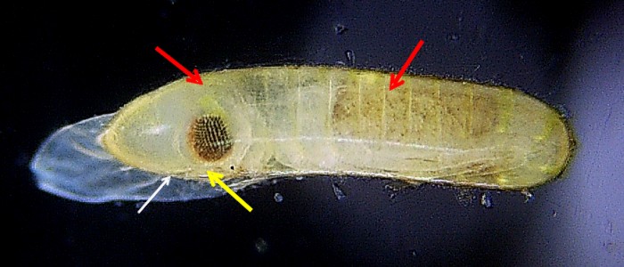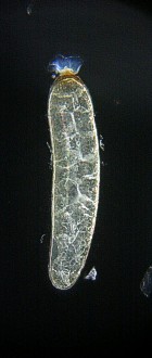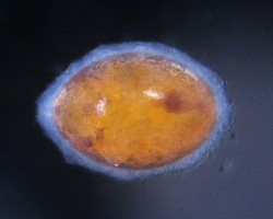 胚の頭部になる部分は最初は卵の後方にありますが,胚の反転を行い頭部は卵の前端の方を向きます.胚が反転することによって,孵化する時, 前幼虫が産卵植物から出られるようになります.胚反転の動きは速く,うっかりすると見逃してしまいます.