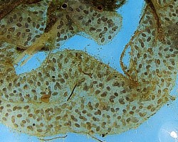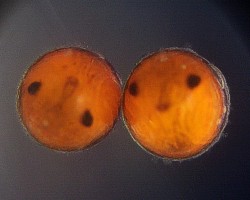 卵を取り巻くゼリー状の物質 トンボ科,エゾトンボ科,サナエトンボ科の一部の卵では卵の周囲に粘着力の強いゼリー状の物質があります.採卵後,持ち帰った卵が.一塊(ひとかたまり)になってしまったときは,中心部の卵が酸素不足などで発生しないことがありますので,針やピンセットで広げておきます.アカネ属の卵は大きめの容器に入れておくと,卵を取り巻くゼリー状の物質が広がると同時に卵がある間隔を保つようになりますが,小さな容器のまま置いておくと一塊になってしまうことがあります.この 卵を取り巻くゼリー状の物質は取り除いても,卵の発生には影響ありませんので、内部がよく見えない卵については、取り除いて観察してもよいと思います.