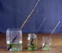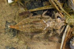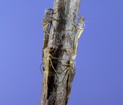 その他 小さな瓶には幼虫は1頭ずつ入れます.狭い場所に多数入れると共食いすることがあります.餌は毎日少しずつ与えます.ジャムの 瓶などのように小さい容器では,水が汚れるのでこまめに水を入れ替えるえる必要があります.小さな容器には,落ち葉1枚か2枚程度を入れておきます.落ち葉の下で餌を待っています.砂を入れると水を替えにくくなります.大きな水槽では川砂を入れ,オオカナダモ,クロモ,コカナダモなどの水草を入れておくと,水を替えなくても長期間水は汚れません.渓流に生息している種の飼育では,酸素が不足することがありますので,熱帯魚などの飼育に使うエアーポンプを使うことがあります. 翅芽(しが)が膨らんできて,餌を食べなくなると羽化が近いので,羽化するときにのぼる棒を入れておきます.すべりにくい木の枝がよいでしょう.乾燥した場所では失敗する種もありますので,そのような種は,あまり乾燥させないよう,大きな水槽の中や,水を少し入れた大きな浅い容器の上に瓶を置くなど工夫して羽化させます.