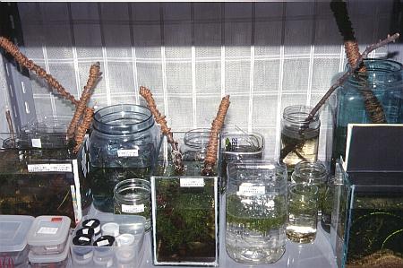 トンボの幼虫を飼育し羽化させる このページの最終更新日は2008年6月19日です. 採集してきた幼虫の名前がわからないときや羽化の観察のように中齢幼虫から終齢幼虫までを飼育し,羽化させるときの飼育用具や注意点について書いてみました. 幼虫を飼育するときに使う瓶(びん)など 採集してきた幼虫を飼育する容器は何でもかまいません.ガラスの瓶は洗うといつまでもきれいに使えます.ジャムなどの空き瓶などが適当です.海苔 (のり)のはいっていた瓶は大きさが適当ですが,割れやすいので注意が必要です. 一時的に使うのなら,ペットボトルの上部を切って下の部分だけを使うのが便利です.これは割れないので安心して使えます.透明なプラスチックの容器も割れにくいのでよく使っています.写真手前の小さな容器は卵用です.写真の場所は,羽化したトンボが逃げ出さないように,鉄製のラック全体をカーテンの生地で作ったネットでおおえるようにしています.