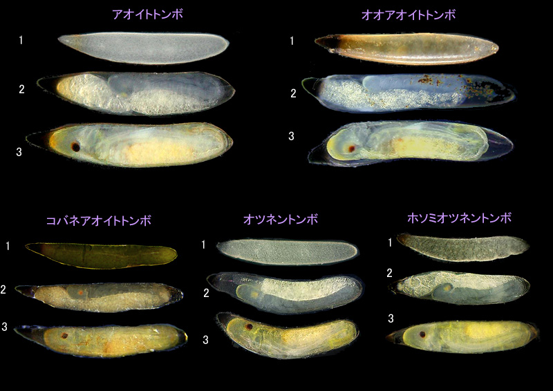 2:産卵後8日目の卵 3:産卵後12日目の卵)