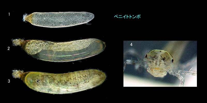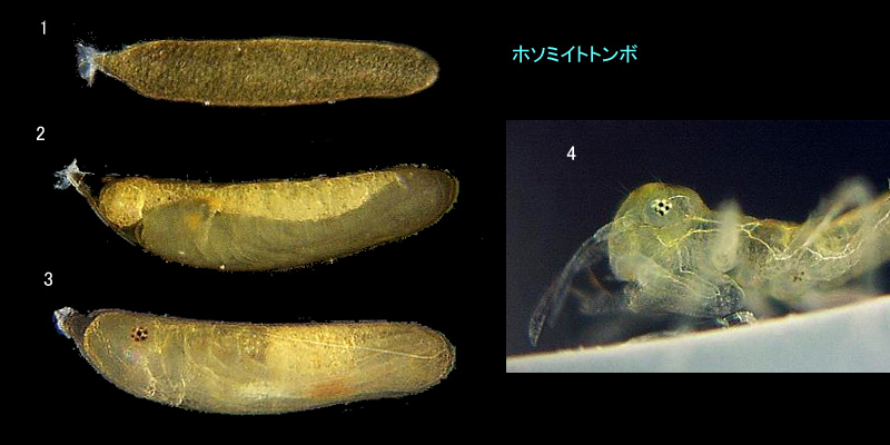 卵の大きさ:産卵直後0.95mm×0.20mm.孵化少し前1.07mm×0.25mm.卵期:最短8日.平均(半数孵化)9日.(写真 1:産卵後1日目の卵 2:産卵後5日目の卵