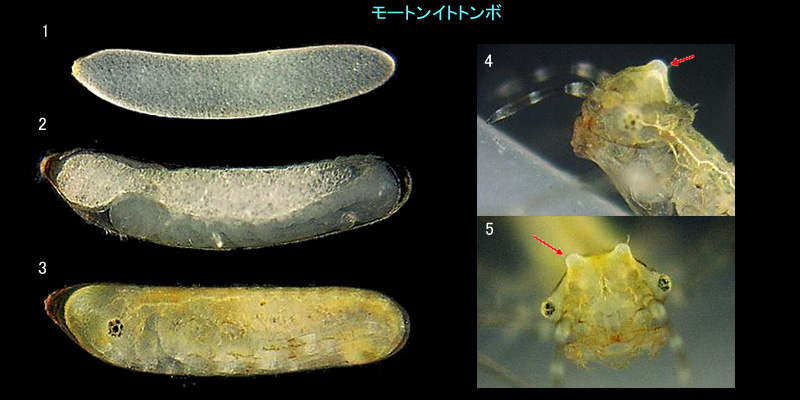 下の写真の中の1は産卵直後の卵,2は胚反転ころの卵,3は完成卵(まもなく孵化する卵)です.4,5は1齢幼虫の頭部の様子です.