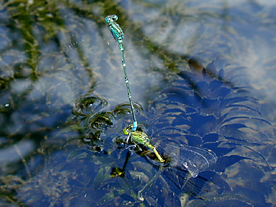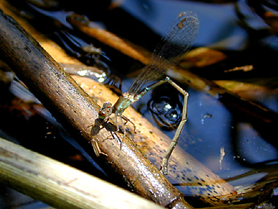 ヒヌマイトトンボの産卵 ♀単独で産卵します.単独で産卵するのはモートンイトトンボ,ヒヌマイトトンボ,アジアイトトンボ,アオモンイトトンボです.2000年7月2日撮影 兵庫県豊岡市 |