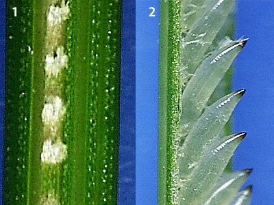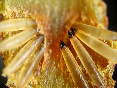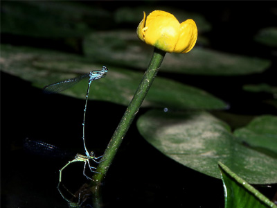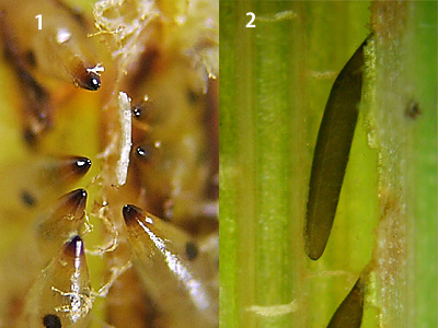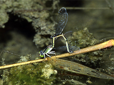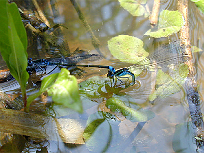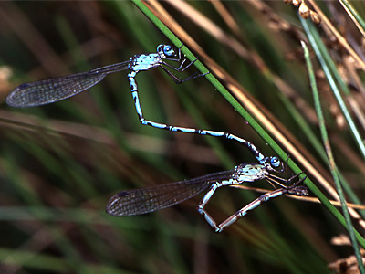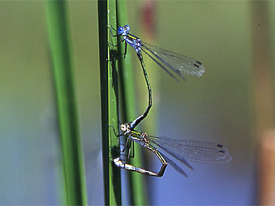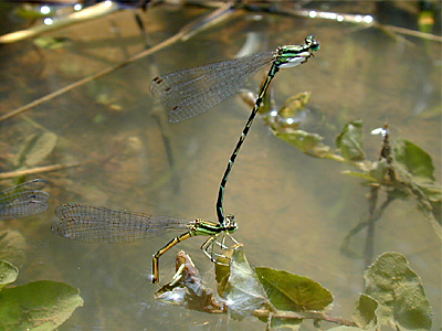イトトンボ科 連結産卵 (れんけつさんらん)するものとアオモンイトトンボ属のように単独(たんどく)で産卵するものがあります.産卵しているところを見つけて,その植物を持ち帰ります.植物に よっては産卵痕(さんらんこん)がはっきりみえることがありますので,そのような場合は産卵痕のある植物を持ち帰ります.