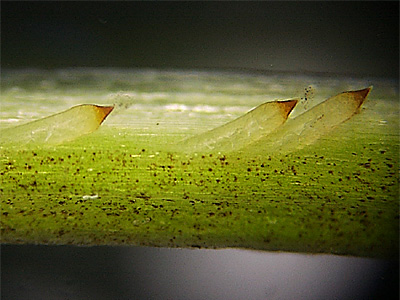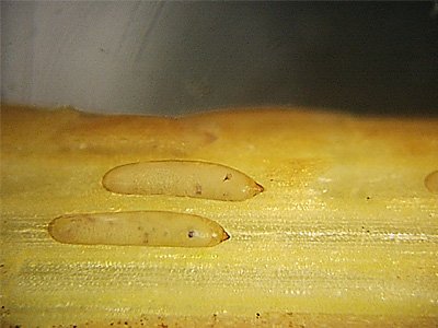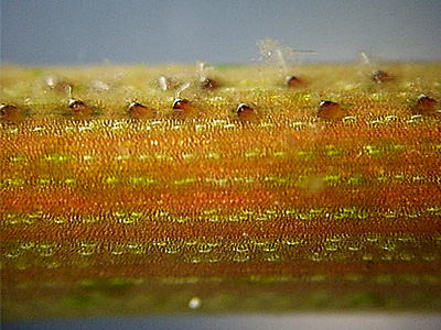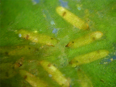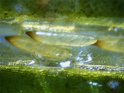 アオイトトンボ科 野外で産卵しているところをよく見かけるトンボです .産卵植物を持ち帰り,卵を取り出します.産卵痕(さんらんこん)がはっきり見えるえること多いようです.