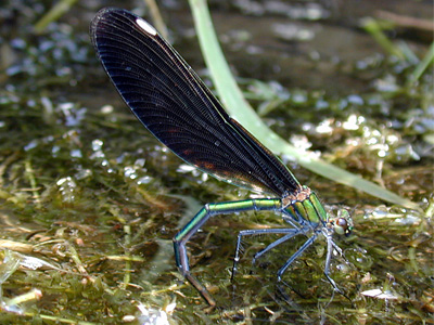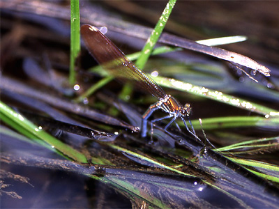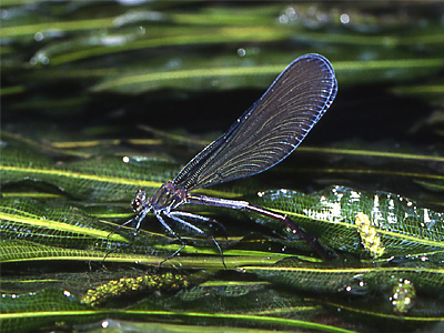 カワトンボ科 ろ紙などには産卵しにくいので, 産卵しているところを見つけて,ゆっくり近づき産卵している植物を確認してその植物などを持ち帰ります.