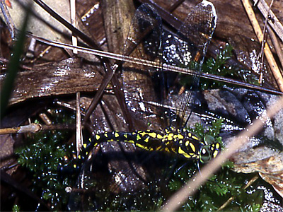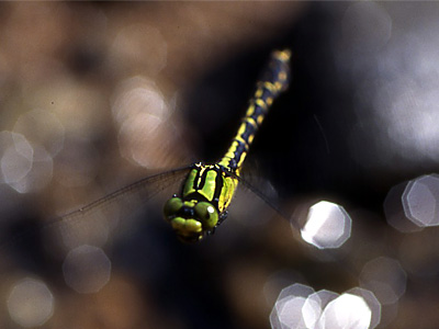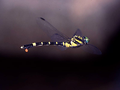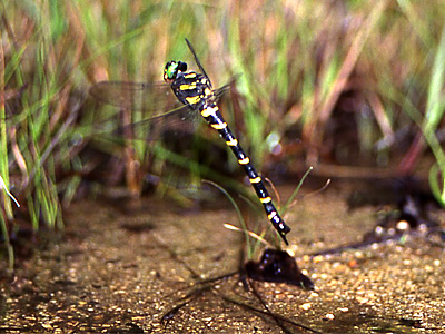 オニヤンマ科 湿地のごく緩やかな流れの ,浅い砂地などに産卵管を突き刺すようにして産卵します.産卵中はあまり逃げませんので,産卵した場所を近くからしっかり見ておき,産卵後産卵したあたりの砂を持ち帰ります.あまり多く持ち帰ると,卵を探すのが大変ですので,できるだけ正確に見ておき ,少量の砂と水を持ち帰ります.持ち帰ったあと,その砂を平たい容器に移し,水を加えて1日ぐらい経過してから卵を探します.はじめは卵か砂粒か見分けがつきませんが,1日 後には卵はオレンジ色に変化しますので,砂の中から卵をスポイトで吸い取ります.