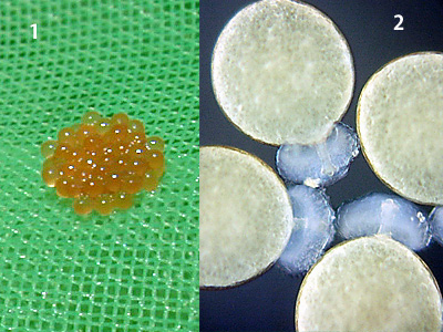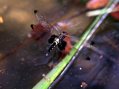トンボ科 産卵中の♀を採集し,生殖弁 (せいしょくべん)のある腹端を小容器の水に入れると卵を出します.この方法で採卵できないコシアキトンボ,コフキトンボ ,アメイロトンボは卵を産みつけた植物などを採集します.