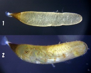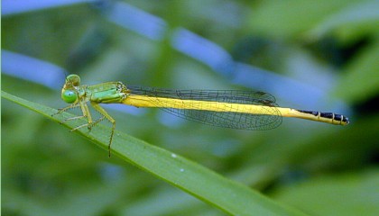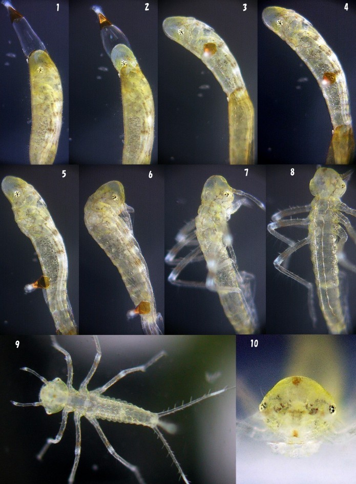 1:Situation of the egg of 40 minutes before that the prolarva comes out from the egg 2:Situation of the egg before about 4 minutes that the prolarva comes out from the egg. Cap of exochorion sometimes shines to orange 3:Prolarva begins to appear from the egg 4:Prolarva 5,6,7,8:First instar larva appears from the prolarva 9:First instar larva 10:There is not a protrusion like the horn in the head of Ceriagrion melanurum. The states of the hatching of the species of most of the Coenagrionidae are similar as Ceriagrion melanurum.