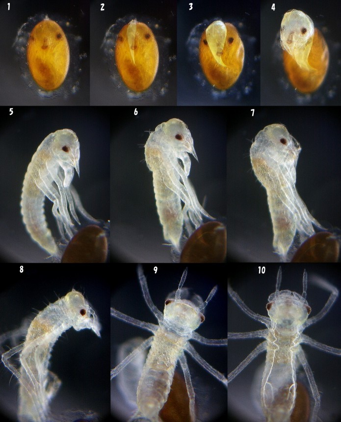 Hatching 1:Egg 2,3,4:Prolarva begins to appear from the egg 5:Prolarva 6,7,8:First instar larva appears from the prolarva (Protrusion like the horn appears in this time) 9,10:First instar larva