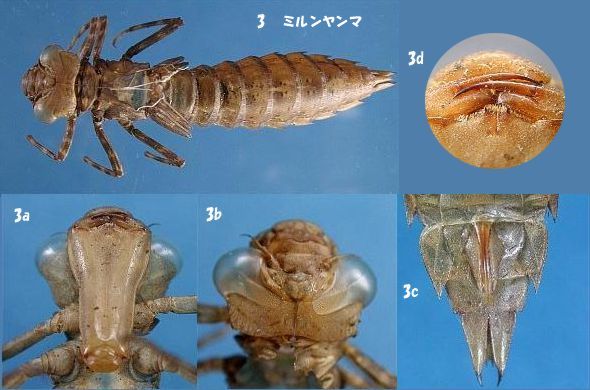 | 3 Planaeschna milnei (Selys) Size of exuviae Length: 37-40(average:38.5)mm, Head width :8.3mm, Width of the abdomen: 8.4mm ( The width of the abdomen is a maximum value.) Lateral spine is in 5-9 abdominal segment. |
