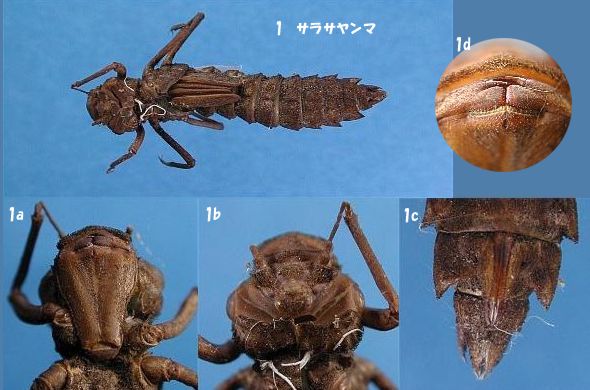 Each sign is expressing the following. a: labium, b: figure that saw the head from the back, c: female primary genitalia, d: end hook of labium As for the figure of the whole shape of exuviae the magnifying power is same.