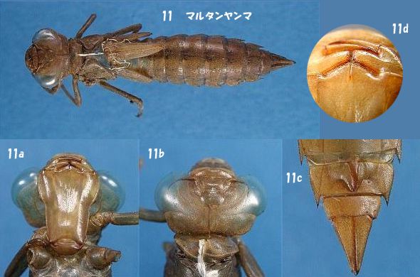 | 11 Anaciaeschna martini (Selys) Size of exuviae Length: 37-42(average:38.3)mm, Head width :8.1mm, Width of the abdomen: 7.9mm ( The width of the abdomen is a maximum value.) Lateral spine is in 6-9 abdominal segment. Exuviae of Anaciaeschna martini resembles in Aeshna juncea. However, exuviae of Anaciaeschna martini is a little bit small. There are 2 dark line form patterns in the abdomen back of the larva of Anaciaeschna martini. There are many cases this pattern is remaining to exuviae. Labium of Anaciaeschna martini is shorter than that of Aeshna juncea. |