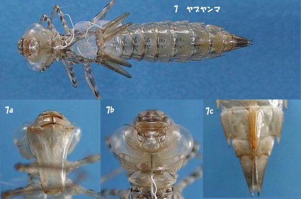 | 6 Gynacantha japonica Bartenef Size of exuviae Length: 33-38(average:36.0)mm, Head width :7.5mm, Width of the abdomen: 6.0mm ( The width of the abdomen is a maximum value.) Lateral spine is in 6-9 abdominal segment. |