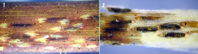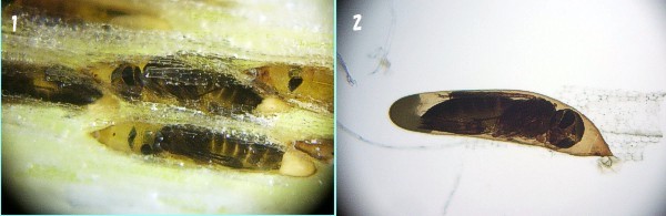 Figure2-2: Some eggs of Cercion calamorum calamorum in the plant. 1. A state outside the plant 2. A part on the surface of the plant was torn off.
