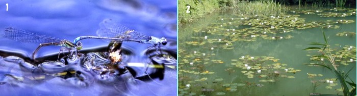 Figure2-1: 1. Oviposition of Cercion calamorum calamorum 2. The environment which Cercion calamorum calamorum inhabits Cercion calamorum calamorum inhabits a wide range in such cases as the pond, the lake ,the irrigation canal and the river of the slow flow.