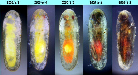 Figure4-3: Epiophlebia superstes egg which an egg-parasitoids wasp parasitized Growth for 6 days The growth of the egg-parasitoids wasp is fast. An egg-parasitoids wasp is already a pupa when the egg which it doesn't parasitize turns over as to the embryo. An egg-parasitoids wasp emerged earlier than hatching of the egg of Epiophlebia superstes. Then, laying is begun soon after the emergence. But, there are larvae of the egg-parasitoids wasps which doesn't grow up in the eggs, too.