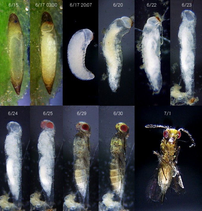 | Figure18-5 Egg parasitoids wasp of Mnais pruinosa From June 14, 2005 to July 1, 2005 This egg is the egg of Mnais pruinosa in moss. This larva came out from the egg on June 17. The larva turned a pupa on June 23. And, this pupa emerged on July 1. |