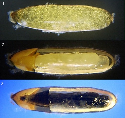 Figure12-5:Scelionidae 1: April 26, 2004 2: May 12, 2004 3: May 22, 2004 I collected this egg on December 4, 2003. It was May 26, 2004 that the wasp appeared from the egg.