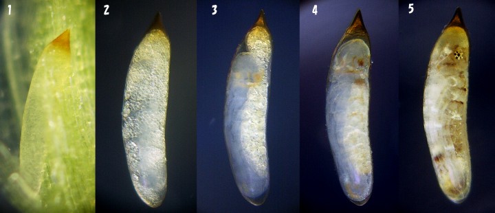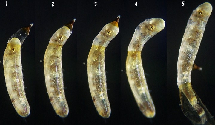 | Hatching From several hours before a prolarva appears from an egg the anterior part of an egg begins to grow. A prolarva appears from the egg, after the anterior part of the egg grew. And a first instar larva appears from the prolarva. 1:Ten minutes before the prolarva appears 2,3:Prolarva appears to the anterior part of the egg 4:Prolarva comes out from the egg 5:Prolarva |
