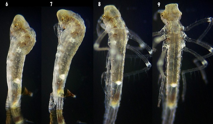 | 6:Back of the thorax of the prolarva swells out 7,8,9:First instar larva appears from the prolarva |