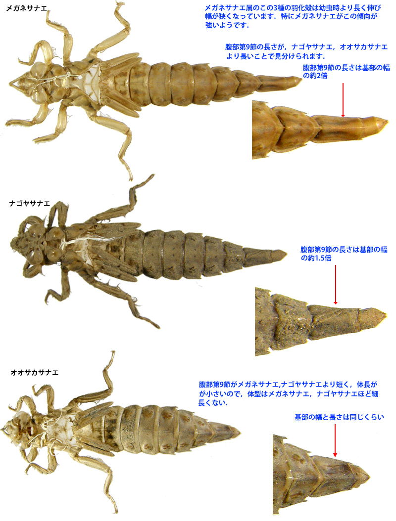 腹部第9節,腹部第10節の長さはメガネサナエより短く,オオサカサナエよりは長いことで見分けられます.