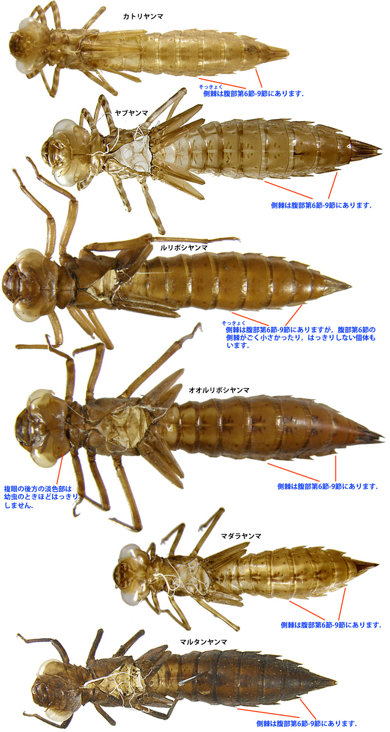 腹部第6節-9節にあります. ルリボシヤンマに似ていますが,マルタンヤンマはやや小さく,腹部背面に縦にはっきりした黒い2本の筋が,羽化殻でも残っていることが多く,8節の側棘がやや長いこと,下唇はルリボシヤンマより短いことなどで見分けます.