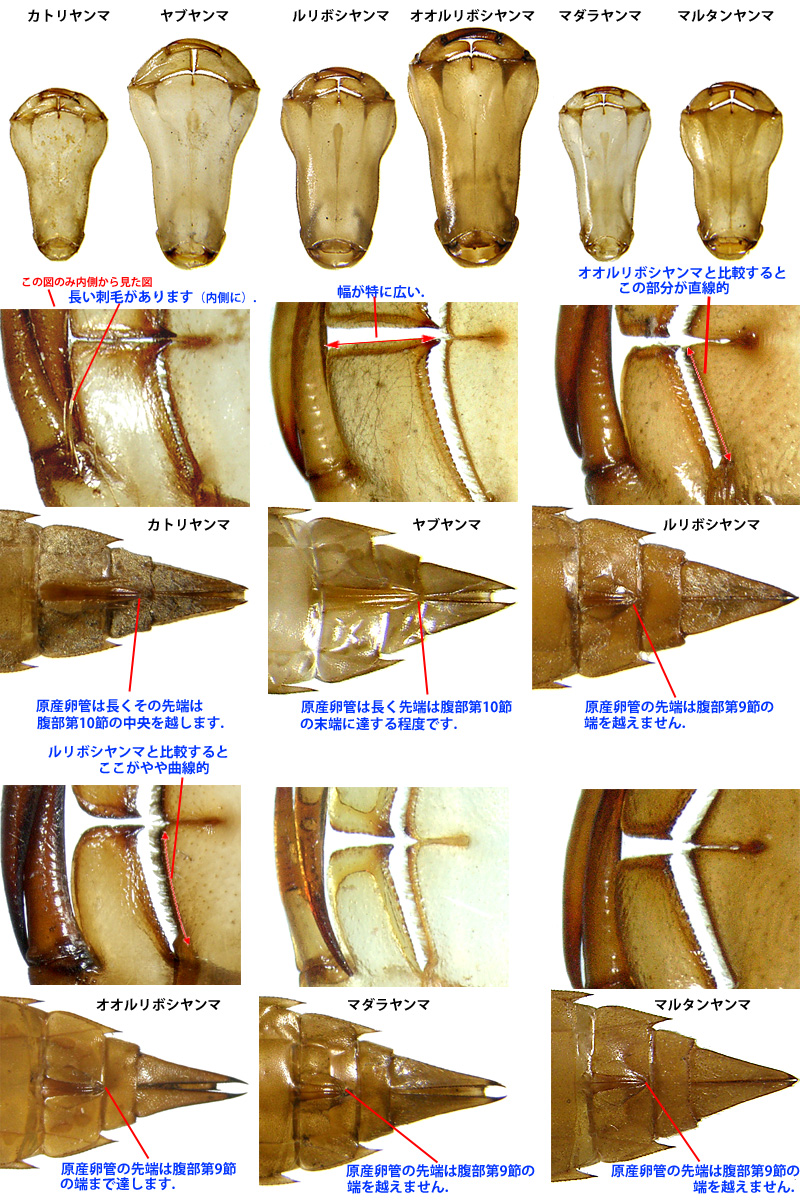 腹部第6節-9節にあります.腹部第6節の側棘は小さいまたははっきりしない個体もあります.オオルリボシヤンマと似ていますが,ルリボシヤンマは下唇が短く,その他下唇中片の形,♀では