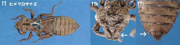 17 ヒメクロサナエ Lanthus fujiacus (Fraser) 羽化殻の大きさ21-23(21.8)mm.頭幅5.3mm.腹部最大幅6.2mm.側棘は7-9節にあります.背棘はありません.腹部がつるっとしていて丸みがあり,触角も幅広く,他種と見分けられます.
