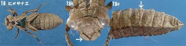 18 ヒメサナエ Sinogomphus flavolimbatus (Oguma) 羽化殻の大きさ18-20(19.3)mm.頭幅5.1mm.腹部最大幅5.9mm.側棘は8,9節にあります.背棘は3-9節にあります.背棘は盛り上がった程度のはっきりしないものです.側棘も先は尖っていません.特徴ある背棘で見分けられます.