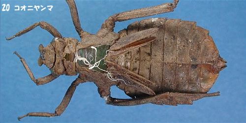 20 コオニヤンマ Sieboldius albardae Selys 羽化殻の大きさ36-41(38.9)mm.頭幅7.9mm.腹部最大幅17.7mm.側棘は2-8節にあります.背棘は2-6節にあります.特徴のある形で他種と間違うことはありません.