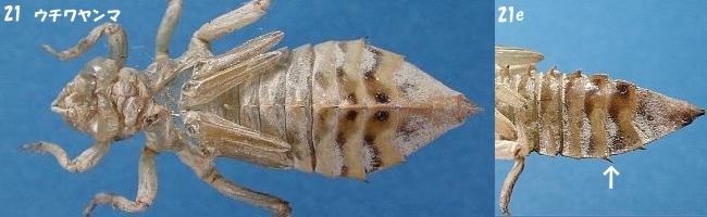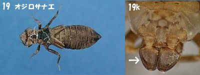 19 オジロサナエ Stylogomphus suzukii (Oguma) 羽化殻の大きさ17-22(19.4)mm.頭幅4.3mm.腹部最大幅5.2mm.側棘は8,9節にあります.背棘はありません.体が細長く,触角(第3節)が三角形に近い形をしていることで見分けられます.