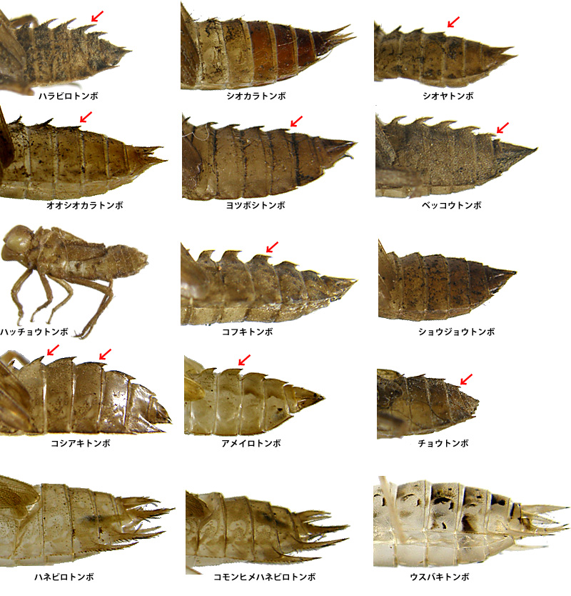 他の種と見分けられます.チョウトンボの羽化殻は体型から見分けられます.チョウトンボには短い背棘が腹部第4-9節にあります.コフキトンボ,アメイロトンボ,コシアキトンボには稜状の背棘があります. |