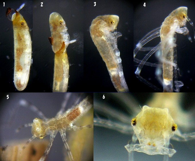 1:Anterior part the egg that grew 2:Prolarva begins to appear from the egg 3:First instar larva appears from the prolarva 4:First instar larva 5:Protrusion like the horn of the head (The size of 2 times of other images)