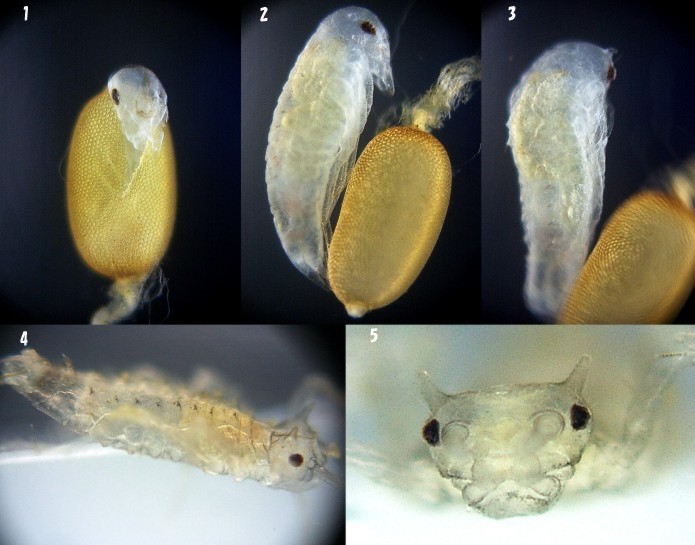 1:Prolarva begins to appear from the egg 2:Prolarva 3:First instar larva appears from the prolarva 4:First instar larva 5:Protrusion like the horn of the head (The size of 2 times of other images)