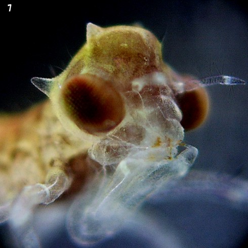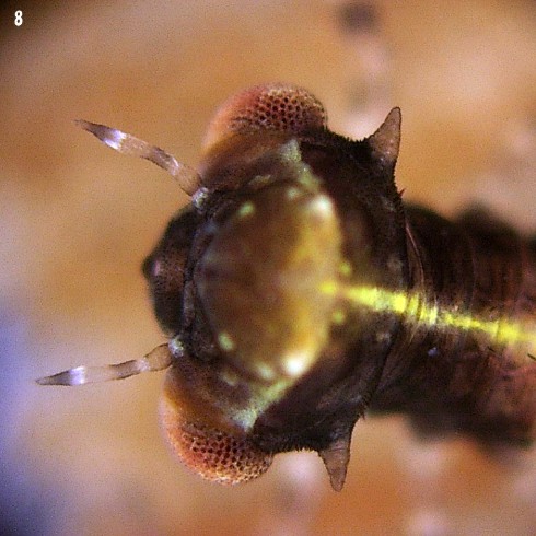 1:Prolarva begins to appear from the egg 2:Prolarva 3,4:First instar larva appears from the prolarva 5:First instar larva 6:Protrusion like the horn of the head (The size of 2 times of other images) 7,8:Protrusion like the horn of the head (The size of 3 times of other images)