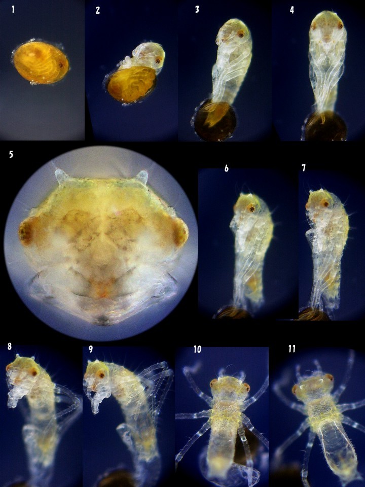 1:Egg 2:Prolarva begins to appear from the egg 3:Prolarva 4,6,7,8,9:First instar larva appears from the prolarva (Protrusion like the horn appears in this time) 10,11:First instar larva 5:Protrusion like the horn of the head (The size of 4 times of other images)