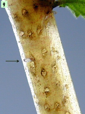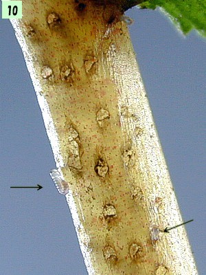 Situation of the scars caused by the act of oviposition Several white arrows are showing the direction that Epiophlebia superstes continued oviposition. |