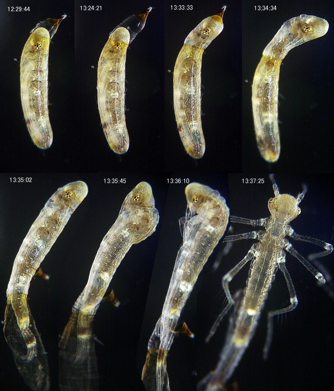 グンバイトンボの孵化 2003/7/3撮影 写真中の数字は(時:分:秒) 産卵植物から取り出した卵を観察したものです. 卵の大きさは孵化直前で約1.19mm×0.26mm. 孵化に要した時間は前幼虫になるまでが29秒,1齢幼虫になるまでが3分3秒でした.均翅亜目の卵は孵化前に前端が伸びだしますので,孵化の観察は比較的容易です.