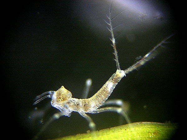 グンバイトンボの1齢幼虫 2003/7/3撮影 頭部の丸みのある突起などはモノサシトンボによく似ています.大きさは体長(頭部から腹部まで)約1.20mm.頭幅約0.33mm.触角の長さ約0.37mm.尾鰓(側鰓)約0.88mmでした.