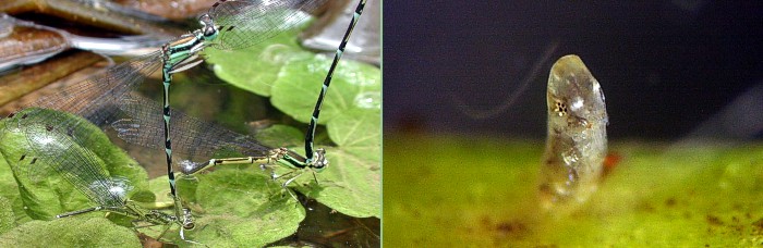 グンバイトンボの孵化 このページの最終更新日は2003年7月4日です. グンバイトンボ Platycnemis foliacea sasakii Asahina 全国的には産地が減ってきていますが,兵庫県あたりでは比較的よく見かけます.モノサシトンボに似ていますが,グンバイトンボの♂の中肢,後肢は白い軍配状になっています.写真左:産卵中のグンバイトンボ 兵庫県三田市 2003/6/21撮影 この写真では♂の肢が軍配状に見えませんが,他の♂が近づいてきたときなどに軍配状の白い肢を伸ばすのでよく目立ちます.写真右:産卵植物から孵化して出てきた前幼虫 2003/7/3撮影 左の植物を持ち帰り,観察を続けたもので卵期は12日でした.