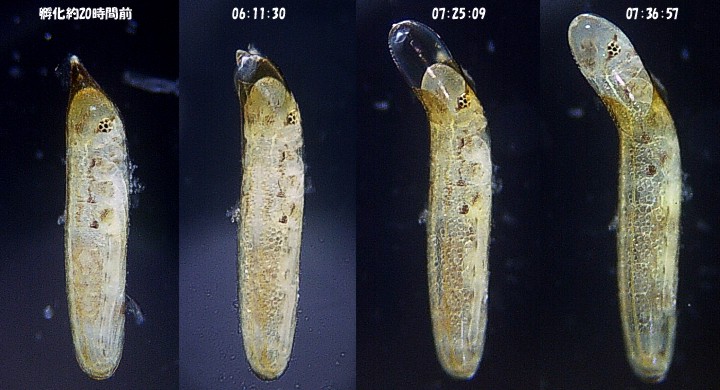 左端の写真は1日前の写真です.卵の前端は孵化数時間前から伸び始めます.この個体は上の卵の変化を観察したのと同じ個体です. |