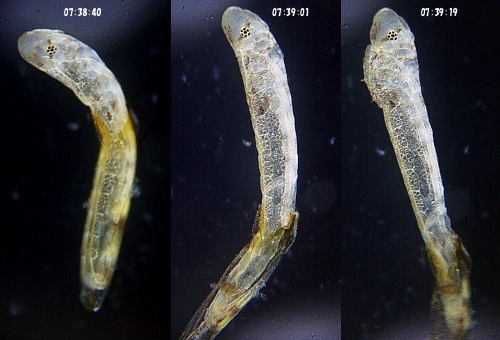 中央の写真が前幼虫です.前幼虫の時期は短く,前幼虫になった後,約15秒で胸部背面が盛り上がり,一齢幼虫が出始めます, |