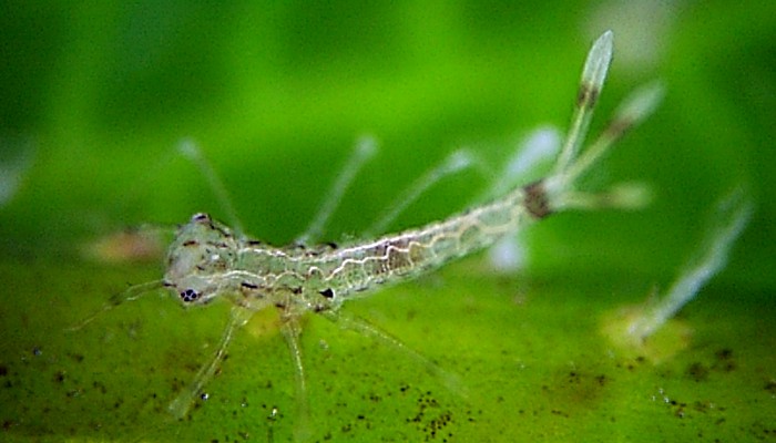 ハグロトンボの一齢幼虫 2005/8/31撮影 大きさ 体長約1.59mm.頭幅約0.40mm.触角の長さ約0.52mm.尾鰓(側鰓)の長さ約0.65mm. |