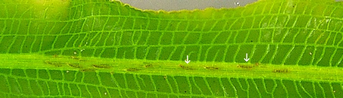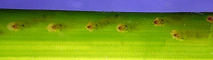 です.産卵植物(ササバモ)から取り出した卵です.これまでに調べた卵期は最短卵期が13日,平均卵期は14日〜15日でした. ハグロトンボの卵の大きさは産卵直後1.22×0.21mm程度,孵化少し前1.38×0.29mm程度です. |