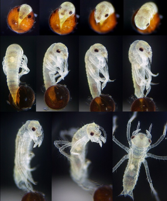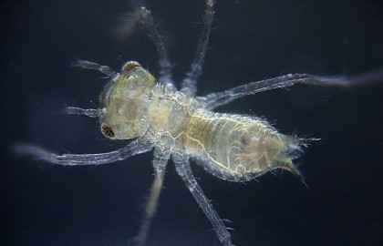 マダラナニワトンボの一齢幼虫 2003年11月18日撮影 大きさ 体長約1.1mm.頭幅約0.39mm.触角の長さ約0.28mm.