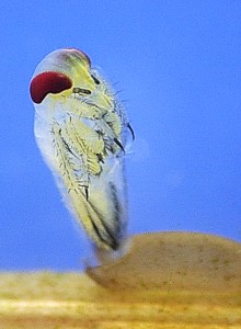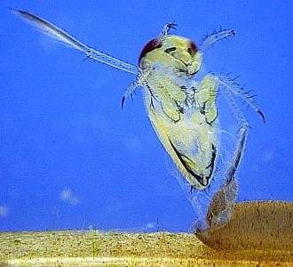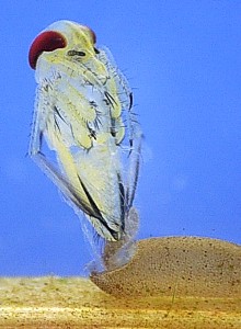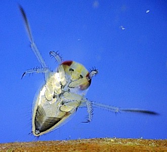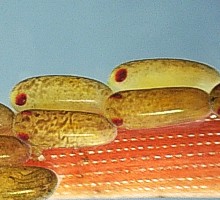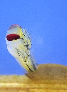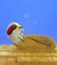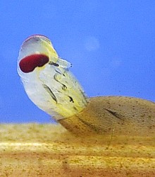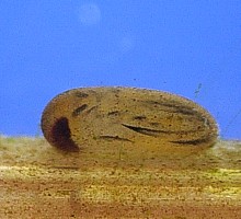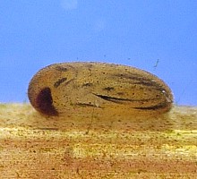 マツモムシの孵化 このページの最終更新日は2005年5月11日です. マツモムシの卵はヒルムシロなどの水草の茎や葉の裏に産み付けられています.アメンボの卵より大きく(下の画像は同じ拡大率ですので比較できます),アメンボとは複眼の形が異なります.トンボの観察をしているときに見つけた卵を持ち帰って,孵化を観察してみました.(マツモムシの卵はトンボの卵より大きいので,このページの卵の画像はトンボの卵のページの1/3に縮小してあります.)