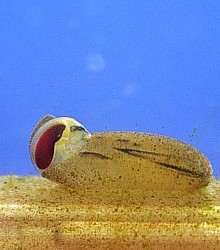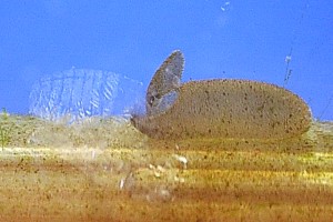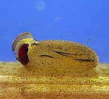 マツモムシの卵の大きさは長径が2.1mm程度です.アメンボの卵の長径は1.4mm〜1.5mm程度です. 次の図の時間は卵の殻が割れたときからの経過時間です.この個体は,卵が割れ始めてから幼虫が卵から離れるまでに約29分かかりました. マツモムシの孵化 2005年5月11日撮影