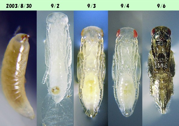 図6-3:ギンヤンマ卵に寄生していた卵寄生蜂の幼虫と蛹 蛹の大きさ約1.35mm.